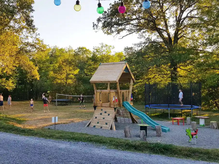 Plusieurs aires de jeux feront le bonheur des enfants: trampoline, tape-cul, cabane en bois, table de ping-pong, badminton, vélo pour les plus petits et bien sur le toboggan gonflable girafe qui surplombe le camping avec ses 6 mètres de hauteur (jeux sous la surveillance et responsabilité des parents ou accompagnateurs).